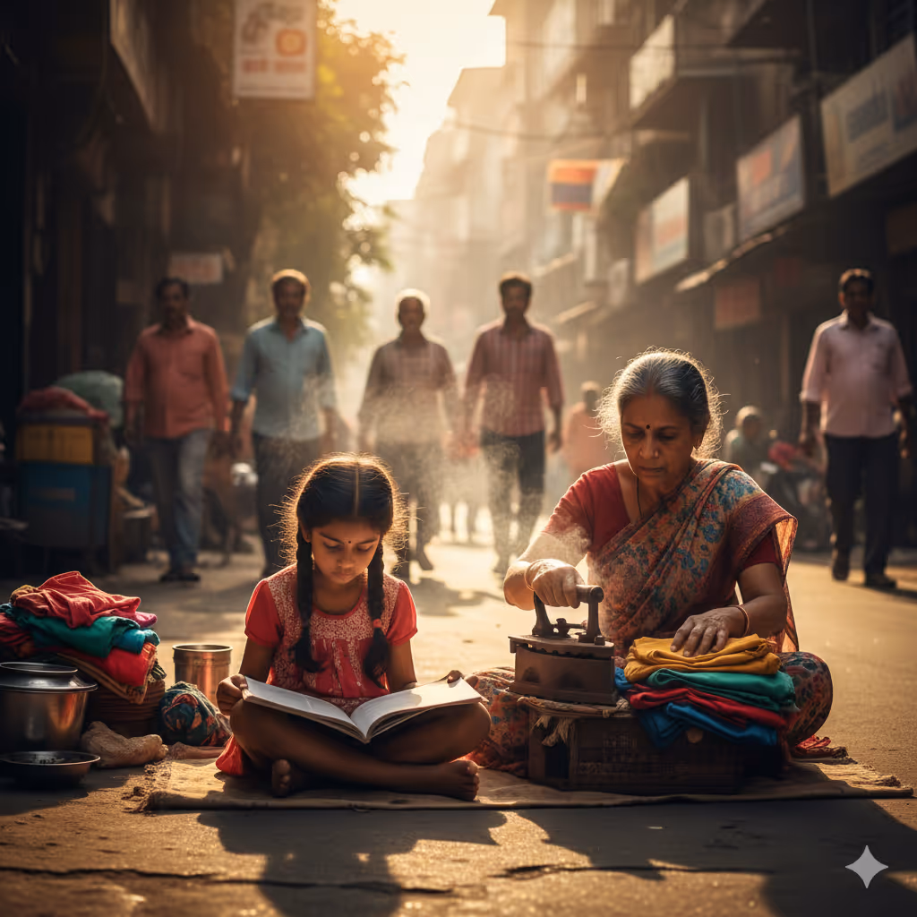 I pass by these folks almost every day when I walk to Jayanagar on some errand. The little girl would be doing her homework while this lady (who I thought was the mother) ironed clothes on the roadside.